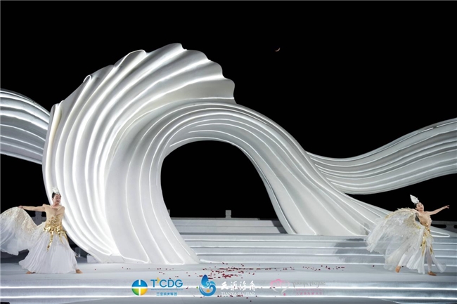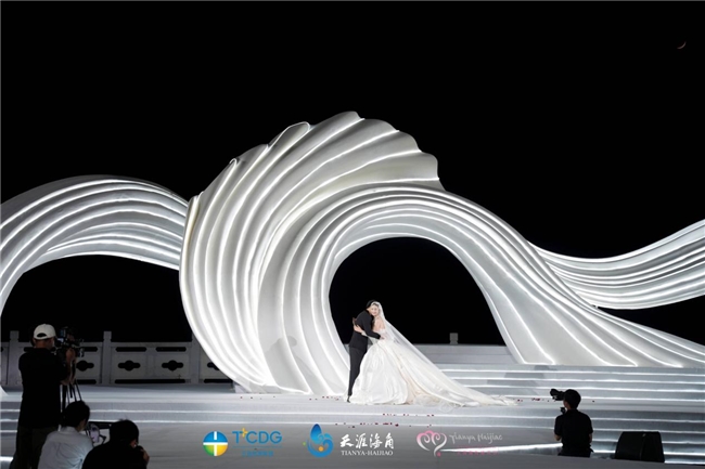 开幕式现场亮点频现,精彩不断,既有展现中华传统婚俗文化的华彩大秀,也有演绎国际潮流的高端婚纱大秀,充分彰显了三亚婚庆产业的创新活力与打造“世界爱情之都”的坚定信心。 值得一提的是,本届婚庆节的主舞台由知名婚礼艺术设计师阿龙匠心打造,以“爱·无界·时空的诗”为主题,巧妙运用“海螺”与“浪花”作为核心视觉符号。舞台中央的“艺术海螺时空隧道”象征着爱情的无限可能与永恒守护,两侧流动的“海浪飘带”则呼应着情感的起伏与人生的韵律,共同构建出一个兼具东方意境与现代美学的浪漫空间,为所有仪式与表演提供了极具感染力的艺术背景。